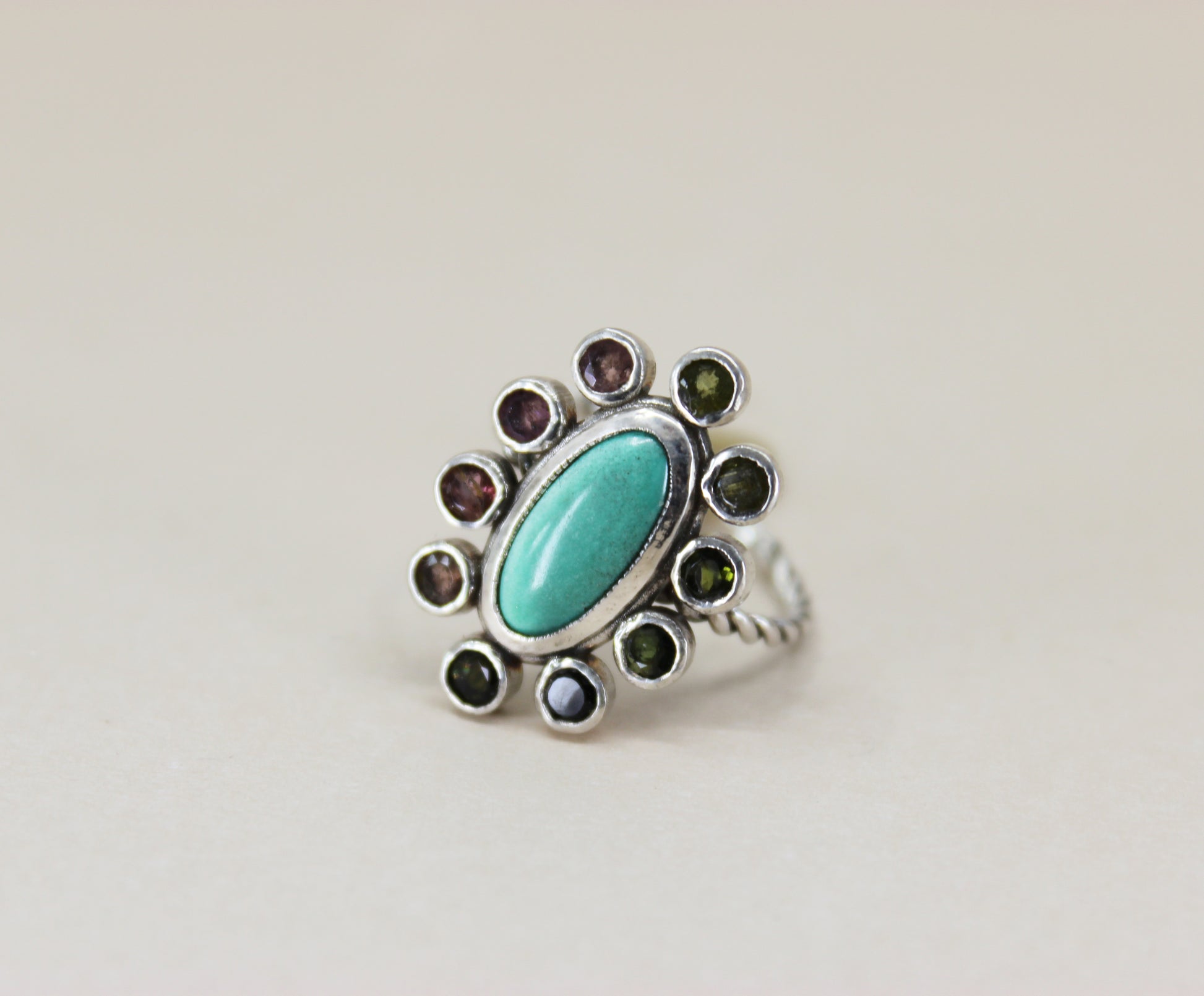 Cast sterling silver ring setting with handset Turquoise and Tourmalines. Small Single cut Tourmalines are arranged in a gradient pattern of greens to pinks. Due to the cut of stones used the tourmalines appear muted in person. A delicate Twisted wire band finishes the ring.